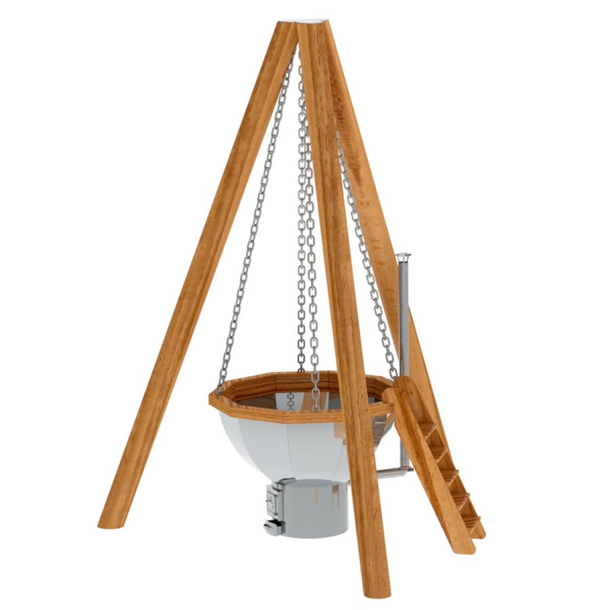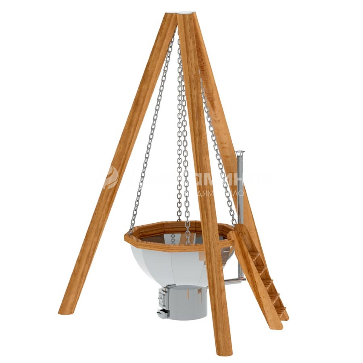 Сибирский банный чан на бревнах с печью, рассчитанный на 8-10 человек, отличается броским, историческим дизайном. Это опора из 3-х больших и грубоотесанных бревен, к которой стальными цепями подвешен котел. Это деревянная лестница и теплоемкая дровяная печь. Внешне эта модель напоминает тот самый волшебный котел из сказки «Конёк-Горбунок» с молоком, водой вареной и водой студеной, и может стать украшением любого участка!