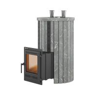 Закрытая каменка печи изготовлена из нержавеющей стали марки AISI 430 толщиной 4 мм. Каменка размещается прямо на пути пламени и горящих газов, что позволяет нагревать камни со всех сторон и быстро достигать температуры 450-500 градусов по Цельсию. Форма каменки обеспечивает максимальное снятие энергии с горящих в топке дров. Объём топки рассчитан на размещение 50-60 кг камней для бани. Для подачи воды в каменку предусмотрены 2 заливные воронки, направляющие воду в нижний и средний ярус заклада каменки. Это позволяет легче управлять паром и получать пар разной степени насыщенности. Облицовка сделана из отдельных планок или полос натурального талькохлорита, которые называются ламелями.