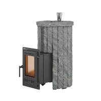 Закрытая каменка печи изготовлена из нержавеющей стали марки AISI 430 толщиной 4 мм. Каменка размещается прямо на пути пламени и горящих газов, что позволяет нагревать камни со всех сторон и быстро достигать температуры 450-500°C. Форма каменки обеспечивает максимальное снятие энергии с горящих в топке дров. Объём топки рассчитан на размещение 50-60 кг камней для бани. Для подачи воды в каменку предусмотрены 2 заливные воронки, направляющие воду в нижний и средний ярус заклада каменки. Это позволяет легче управлять паром и получать пар разной степени насыщенности. Облицовка сделана из отдельных планок или полос натурального талькохлорита, которые называются ламелями.