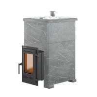 Банная печь Эверест "Steam Master 24 ЧУГУН" Талькохлорит, S-40 предназначена для нагрева помещений и получения пара в парных . Печь изготовлена из Жаростойкого чугуна (ГОСТ 1412-85) и отличается интересной конструкцией. Толщина топки составляет от 8 до 24 мм, в зависимости от детали печи (наиболее термонагруженные участки имеют большую толщину чугуна). Топочная камера печи – сборная, состоит из трёх деталей, соединяемых между собой на болтах. Вертикальные швы по краю деталей соединяются по принципу паз-гребень, что обеспечивает высокую герметичность топки и минимальную деформацию даже при длительном нагреве. Соединение не требует применения уплотнителей шва, достаточно только герметика. Для полного сгорания топлива в топке устроены каналы вторичного дожига, подающие воздух из поддувала в верхние точки камеры, в места скопления разогретых газов. Это обеспечивает максимальную эффективность горения и высокий КПД печи. Чугунная дверь имеет верхнюю и нижнюю системы подачи воздуха. За счёт работы обеих систем регулируется интенсивность горения и обеспечивается чистота стекла во время работы печи. Плотный контакт двери и рамки делает топочное пространство максимально герметичным. Закрытая каменка печи изготовлена из нержавеющей стали марки AISI 430 толщиной 4 мм. Каменка размещается прямо на пути пламени и горящих газов, что позволяет нагревать камни со всех сторон и быстро достигать температуры 450-500°C.Форма каменки обеспечивает максимальное снятие энергии с горящих в топке дров. Выход пара происходит через верхнюю крышку с отверстиями. Для подачи воды в каменку предусмотрены заливная воронка, направляющие воду средний ярус заклада каменки. Облицовка печи выполнена из натурального камня толщиной 40 мм, которая аккумулирует тепло и преображает интерьер банного пространства.