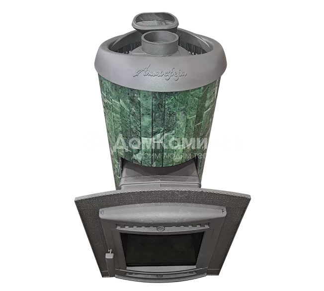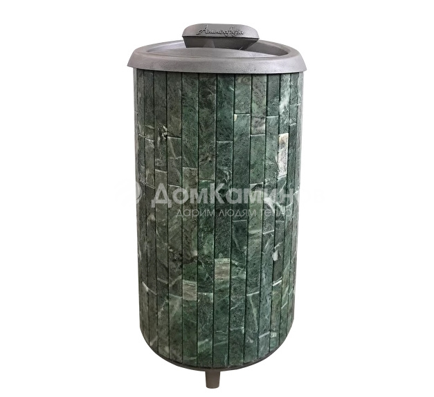 Модель с увеличенной каменкой и повышенной производительностью. Ламели из змеевика по периметру внешней каменки не только обладают хорошими теплонакопительными свойствами, но и предают печи оригинальный внешний вид