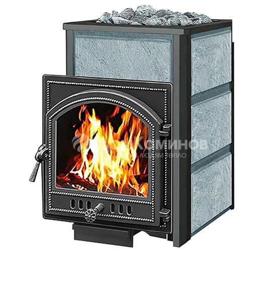 Конвекционно–вентилируемая облицовка, изготовленная из экологически чистой горной породы , который обладает большой теплоёмкостью, что позволяет камню в короткие сроки нагреваться и максимально долго удерживать стабильную температуру в парильном помещении, а также гасить жёсткое инфракрасное излучение Камень обладает исключительными лечебными свойствами: помогает при головных болях, при нестабильном артериальном давлении, при простудных заболеваниях, воспалительных процессах в почках и пищеварительной системе, снимает повышенную возбудимость и нервозность, сглаживает эмоциональные всплески. Облицовка из натурального камня при нагреве способна аккумулировать тепло, что гарантирует максимально равномерный прогрев и сохранение тепла Банная печь ЛЕГЕНДА 16 (224) укомплектован чугунной каминной, самоохлаждаемой дверцей Везувий 224 с большим жаропрочным стеклом «SCHOTT ROBAX», с оборудованной системой самоочистки, что позволяет визуально контролировать горение и любоваться видом живого огня. Данная печь рассчитана на объем парильного помещения 8-18 м3.