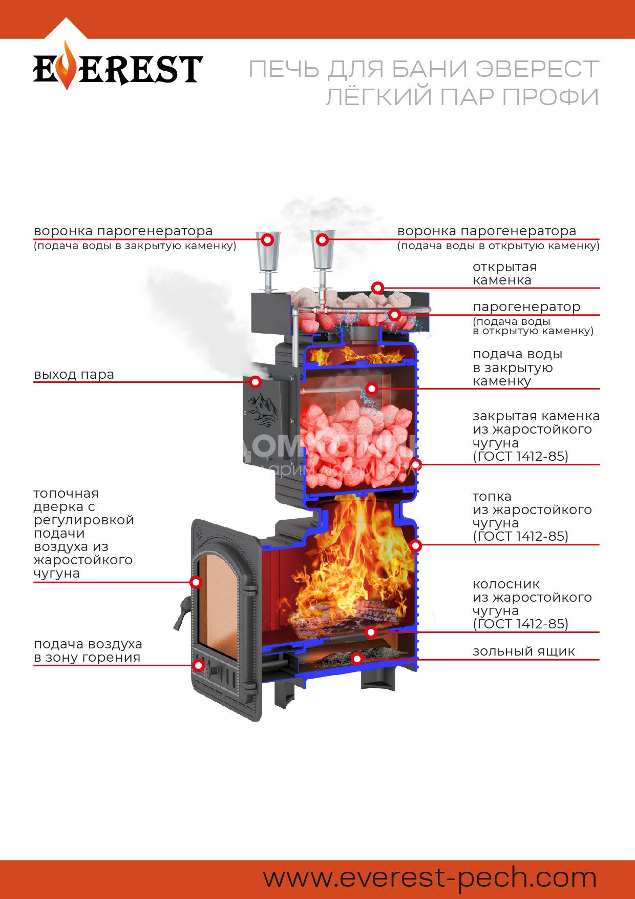 Поворотная чугунная банная печь EVEREST Лёгкий Пар ПРОФИ предназначена для обогрева парных помещений объёмом до 40 кубических метров.