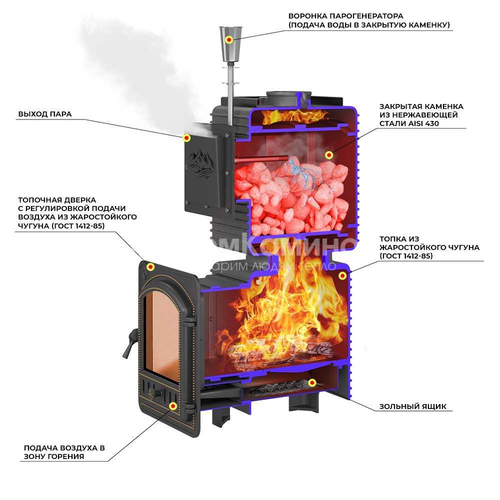 Каменка: Комбинированная (Сетка/кожух + закрытая каменка)