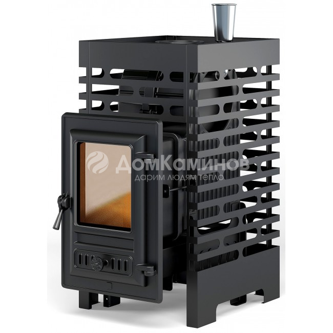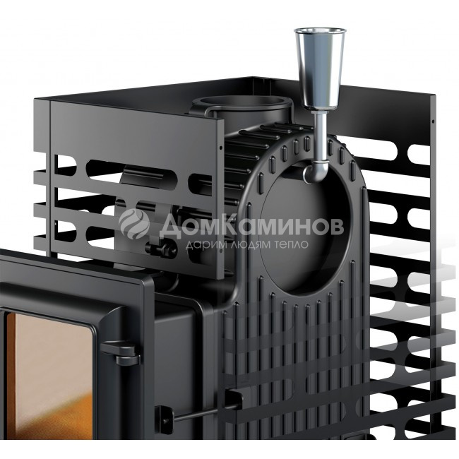 Верх топочной камеры образован закрытой каменкой. 200 мм труба из нержавеющей стали AISI 430 толщиной 3 мм отлично противостоит нагреванию, не коробится под воздействием огня и практически не окисляется. Сварной шов расположен сбоку, что снижает нагрузку на соединение и продлевает срок службы каменки. Керамический шнур размещен на стыке каменки и корпуса печи. Каменка расчитана на размещение 15-18 кг камней средней и мелкой фракции.