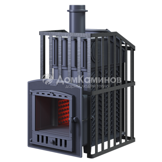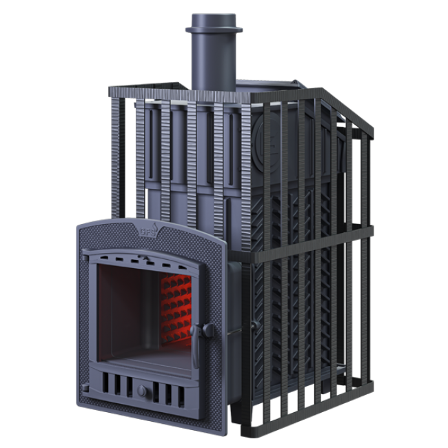 GFS-ЗК Ураган 25 (П)2 - расширенный комплект печи в сетке. Максимально приближенный вариант печи для режимов русской парной, имеющий непосредственно закрытую чугунным коробом каменку, дверцу для пара с ручкой из бука. Печь легко модернизируется до полноценной печи предназначенной для Русской бани путем замены стальной сетки на каменную облицовку без демонтажа дымохода.