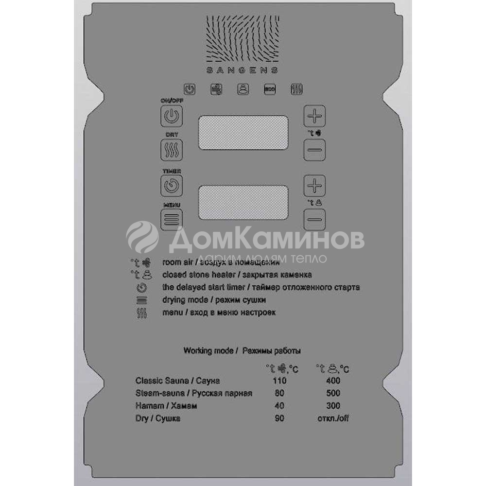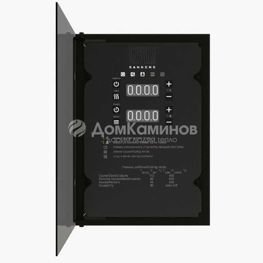 Настройка выполняется при помощи кнопок на передней панели блока. Для индикации используются 2 LED дисплея. Диапазон регулировок: Т закр. каменки: 300-580°C, Т возд.: 0-120 °C.