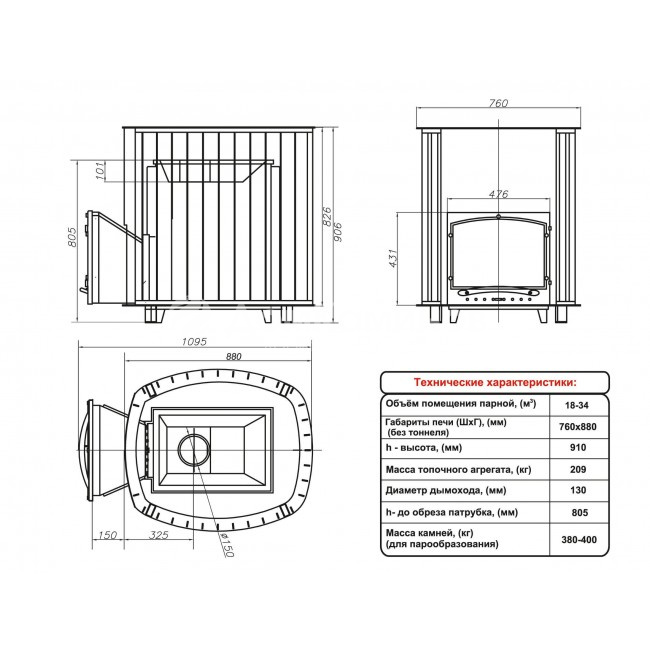 Облицовка печи выполнена в виде решетчатой стальной конструкции, которая вмещает в себя до 400 кг камней и эффективно аккумулирует тепло, позволяя создавать максимально комфортный температурно-влажностный режим в бане.
