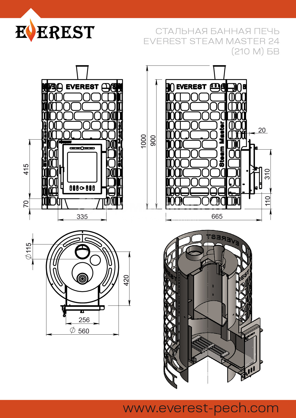 Печь для бани Эверест "Steam Master" 24 (210М) изготовлена из особо прочной котловой стали 09Г2С. Печь предназначена для установки в частные и коммерческие бани с объёмами парных помещений до 24 кубических метров.