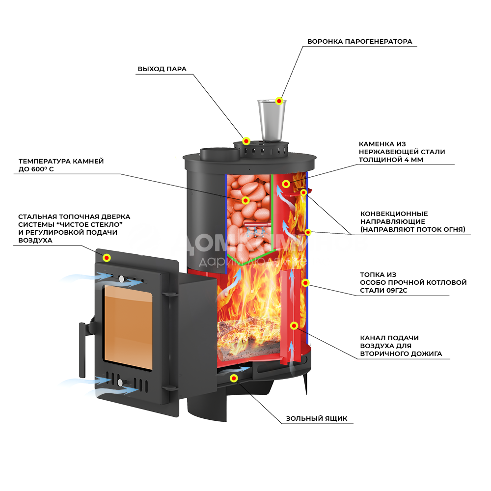 Конструкция печи включает в себя закрытую каменку из нержавейки марки AISI-430 толщиной 4 мм, расположенную в верхней части топки. Каменка размещена прямо на пути пламени и дымовых газов, что позволяет нагреть камни до температур свыше 600 градусов по Цельсию.