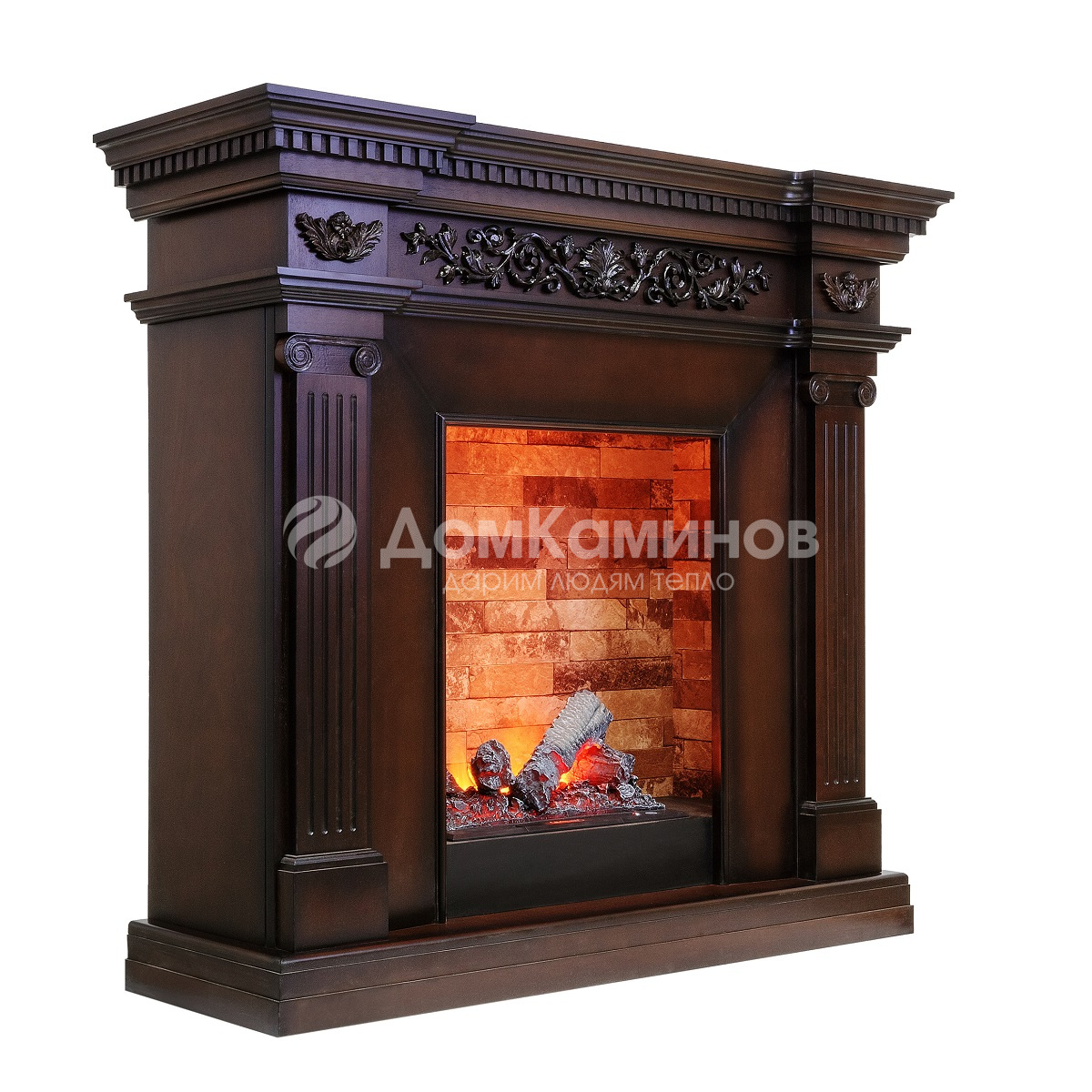 Выполненный в античном стиле портал Dimplex Amalfi представлен в двух цветовых вариантах – махагон коричневый антик и белый дуб. По бокам расположены две античные колонны с лепными элементами на кронштейнах, органично завершая эстетичность внешнего вида портала. Строгие античные линии тонко разбавлены растительным мотивом: фронтон портала украшает изящный барельеф, имитирующий лепнину. Благодаря цветочному мотиву лепного орнамента обрамление приобретает изысканный вид. Высокий подиум завершает элегантный силуэт портала, визуально делает его выше, гармонично завершая изысканный и утонченный силуэт камина. Совместим с очагами серии Cassette 400 производства Dimplex, в которых применена оригинальная технология, имитирующая горение настоящего дерева. Эффект реального пламени выгодно подчеркивает эстетичность портала.