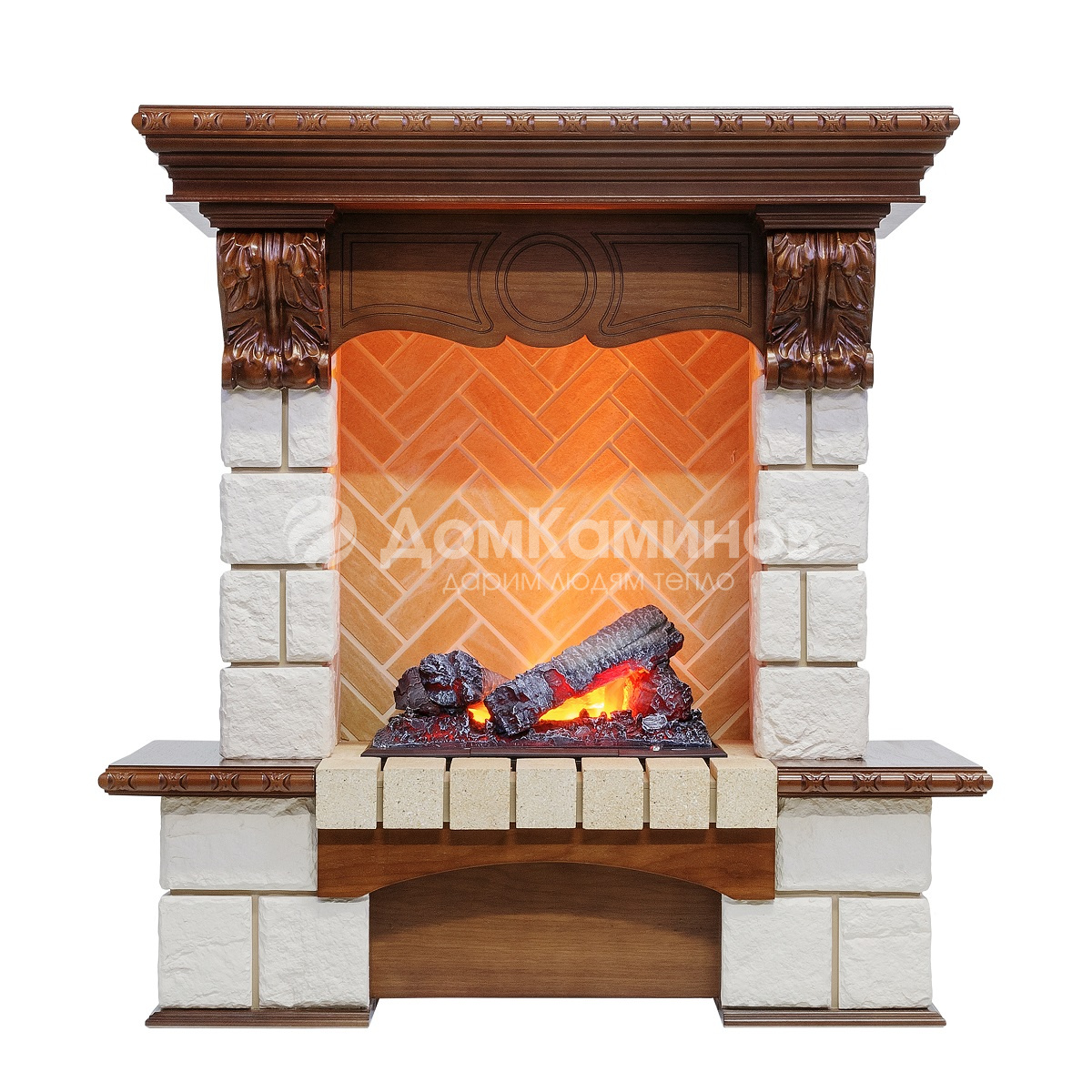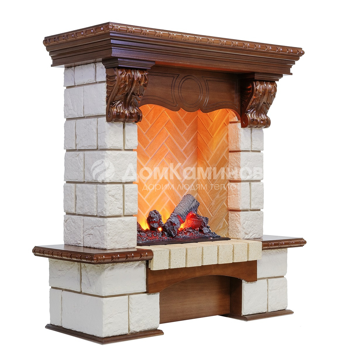 Боковые стенки портала Pierre Luxe облицованы плиткой под натуральный камень, а столешница и другие декоративные детали отделаны шпоном, цвет которого вы можете выбрать из предлагаемого в спецификации списка.