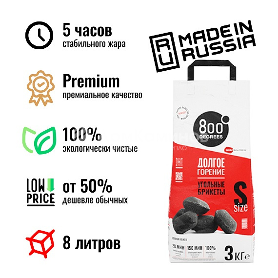 Угольные древесные брикеты 800 Degrees Extra Long Heat в многослойных, плотных бумажных мешках с удобной ручкой для переноски. Производятся по собственной технологии и рецептуре из плодовых и лиственных пород деревьев. Вся продукция рекомендована для приготовления пищи Русским Обществом Барбекю (РОБ) к применению во всех типах угольных и дровяных грилей, хосперах, а также в мангалах, печах и очагах.