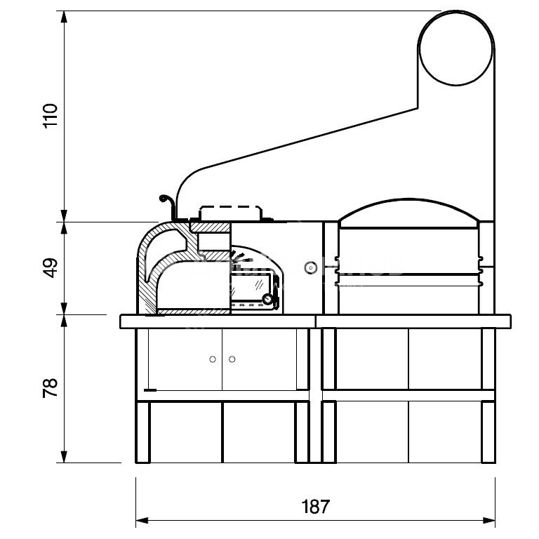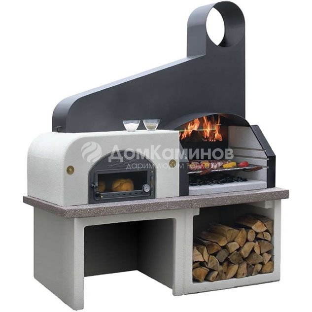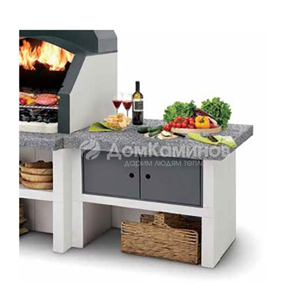 Стол из серой мраморной крошки с полированной столешницей. Гриль имеет вытяжку из нержавеющей стали, окрашенную огнеустойчивой краской. Двойная огнеупорная жаровня. Стальной дымосборник, общий для гриля и духовки. Отсеки для приготовления пищи выполнены из жаростойкого материала. Снабжено решёткой для дров размером 76х40 см. Зольник оборудован системой циркуляции воздуха "fast-fire-box". Духовка выполнена из огнеупорного материала с окрашенной стальной дверцей с термометром и глазком. Для каждого модуля предусмотрены дверцы. В программу входят модуль с газовой плитой, модуль с раковиной.