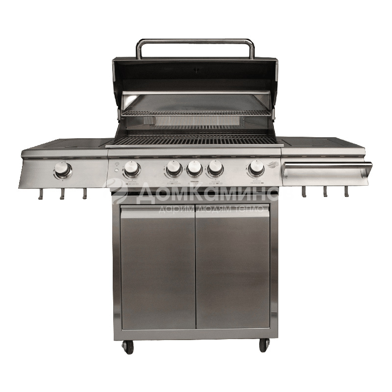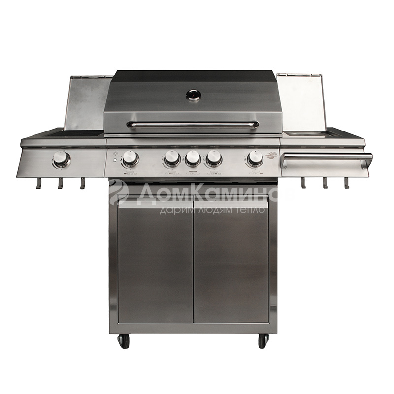 Гриль изготовлен из нержавеющей стали толщиной 2 мм, работает на пропан-бутановой смеси и оснащён четырьмя экономичными литыми горелками мощностью по 4 кВт каждая.