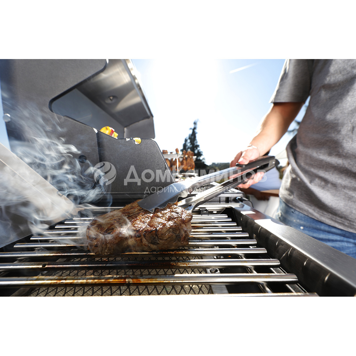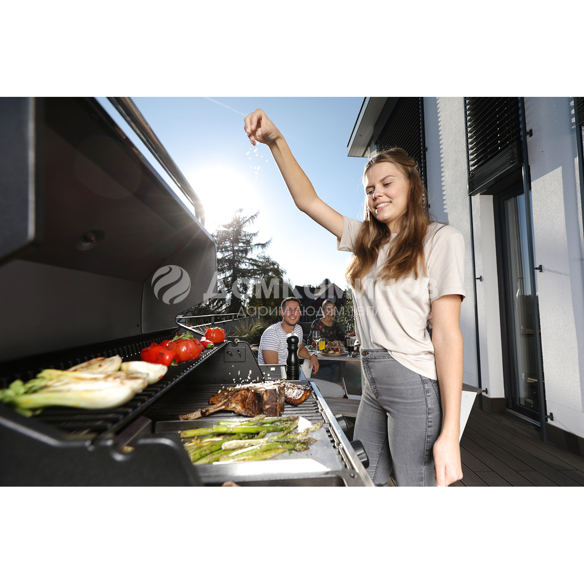 Обновлённый дизайн, складные полки, двухсторонние чугунные решетки, мощная боковая инфракрасная горелка и подсветка ручек управления помогут готовить даже в темное время суток.