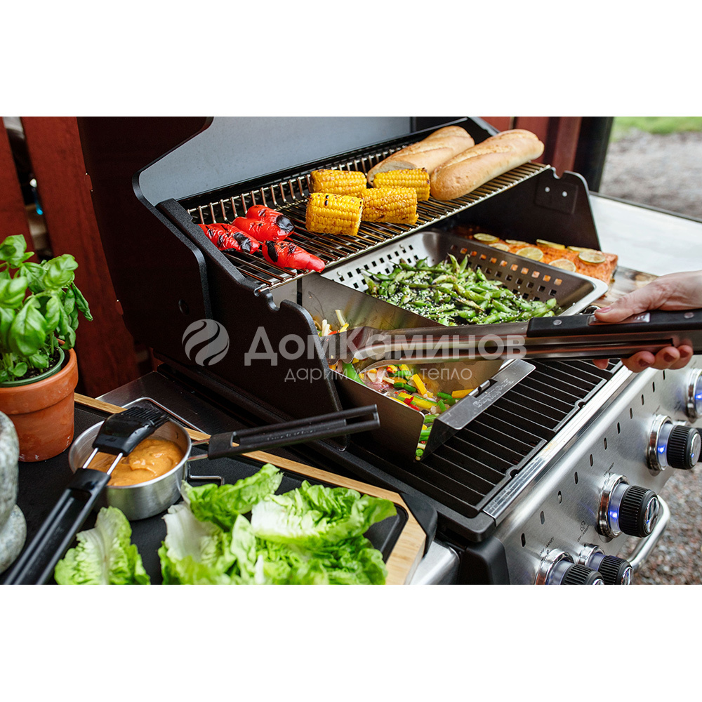 Привлекательный дизайн, складные полки, двухсторонние чугунные решетки, задняя горелка и электромотор вертела делают этот гриль максимально универсальным.