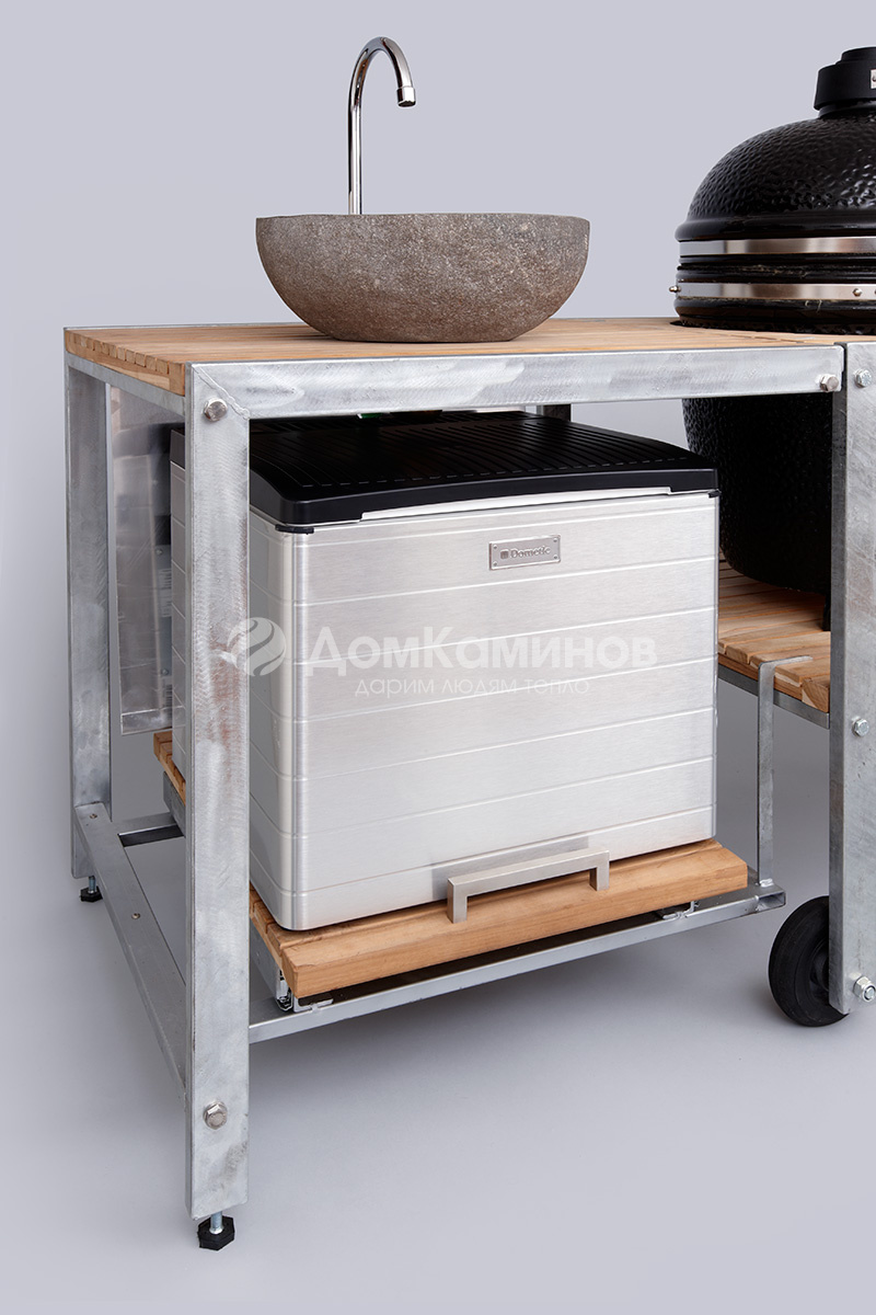 В комплекте: керамический гриль Monolith, массивный стол из оцинкованной стали и тика, раковина из камня и холодильник на 220/12 В. Нижняя полка с холодильной камерой выдвигается для доступа к содержимому холодильной камеры. С обратной стороны кухонного стола, предусмотрено подключение садового шланга для подачи воды. Также предусмотрен слив воды, который выведен в заднюю часть кухни. Данная комплектация имеет все необходимое для приготовления разнообразных блюд, в комплекте также присутствует кочерга, двухуровневая решетка для одновременного приготовления мяса и овощей, керамический отсекатель жара, позволяющий высокой температуре равномерно распределяться под куполом, при этом предотвращая прямое воздействие жара от углей на еду, керамический противень для пиццы, а также направляющая для подачи в барбекю-гриль ароматной щепы для копчения.