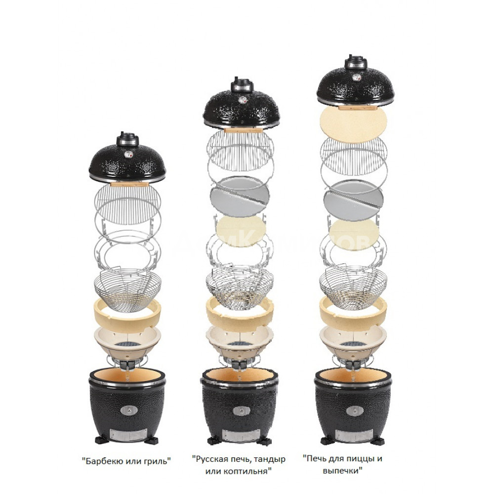 В стандартный комплект поставки грилей Monolith входят ножки с колесиками, а так же все приспособления для использования гриля во всех возможных режимах работы: жароотсекатель и противень из керамики, решетка из нержавеющей стали, второй уровень решетки и специальные приспособление для подачи арома-щепы без открывания крышки гриля. Детальная комплектация для каждой модели описана в рубрике «Аксессуары».