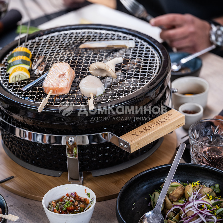 Готовы ли вы поднять свои навыки приготовления на гриле на новый уровень? Тогда настольные грили Shichirin от Yakiniku® - отличный выбор!Круглый Shichirin имеет большую зону гриля диаметром 31 см, которая хорошо подходит для приготовления сразу нескольких небольших или одного-двух больших кусков мяса. Благодаря вентиляционным ползункам Shichirin может быстро достигать высокой температуры, а затем равномерно обжаривать мясо.В корпус керамического настольного гриля Shichirin встроена регулируемая подача воздуха, он имеет отделку из бамбука и нержавеющей стали. Шичирин стандартно поставляется с решеткой из нержавеющей стали и бамбуковой подставкой.