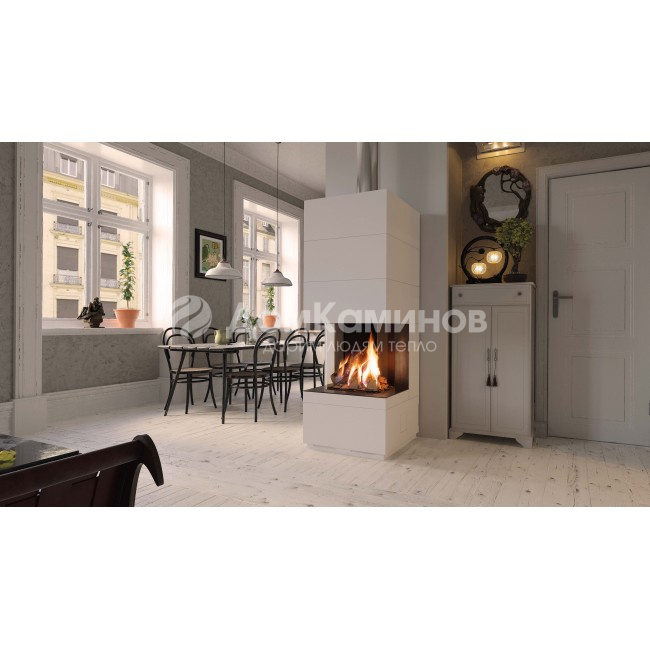 Языки пламени вырываются непосредственно из керамических дров (а точнее говоря, из их верхней части, так, как это происходит в дровяном камине), сложенных в камере горения под углом в 45 градусов. Сквозь керамические поленья пропущены вольфрамовые нити, которые светятся при контакте с пламенем, создавая полную иллюзию тлеющих дров. А светодиодная подсветка создает эффект тлеющих углей. Ее можно включать отдельно, например, летом, когда нет необходимости в обогреве помещения, но хочется создать настроение.