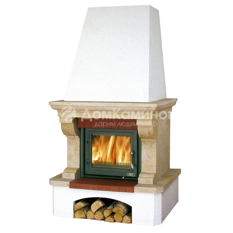 Диаметр выходного патрубка рассчитан на диаметр подключаемой дымоходной трубы в 150 мм. Дымосборник и цоколь окрашены в белый цвет. Притопочная зона выложена огнеупорной керамикой. Встроенные системы "чистое стекло" и "двойной дожиг" топлива.
