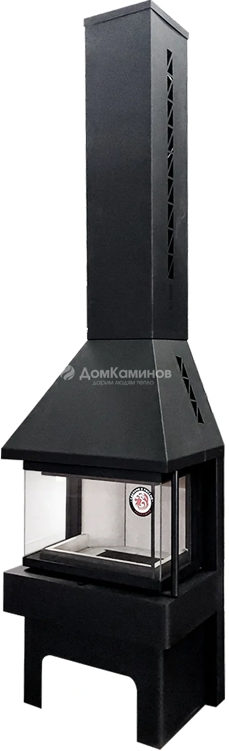ЭкоКамин Панорама – мощная (10 кВт), но довольно простая в установке (требуется только подключение к дымоходу) и использовании каминная печь с трехсторонним видом на огонь. Дымоход подключается горизонтально либо вертикально. Модель обладает элегантным современным дизайном и высоким КПД (80%). Воздух может подаваться в топку печи извне. Имеется система вторичного дожига. Стальной кожух выполнен в черном цвете. Внутри топка футерована литьевым шамотом.