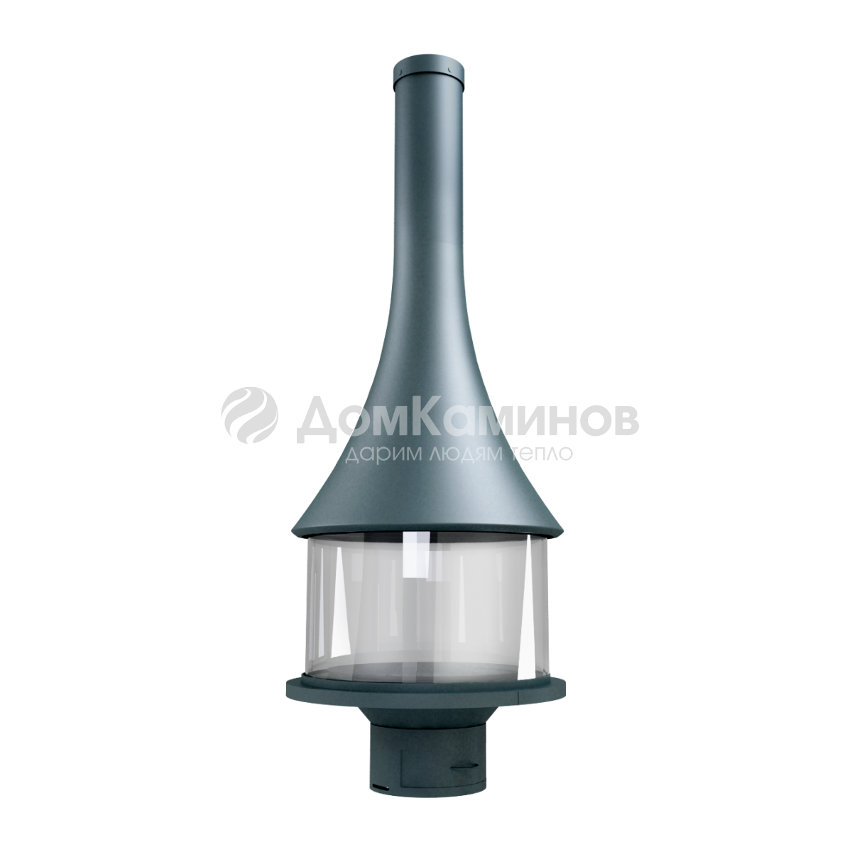 Дровяной камин островного типа. Очаг выложен шамотным кирпичом и закрыт жаростойким стеклом. Цвет: серый антрацит.