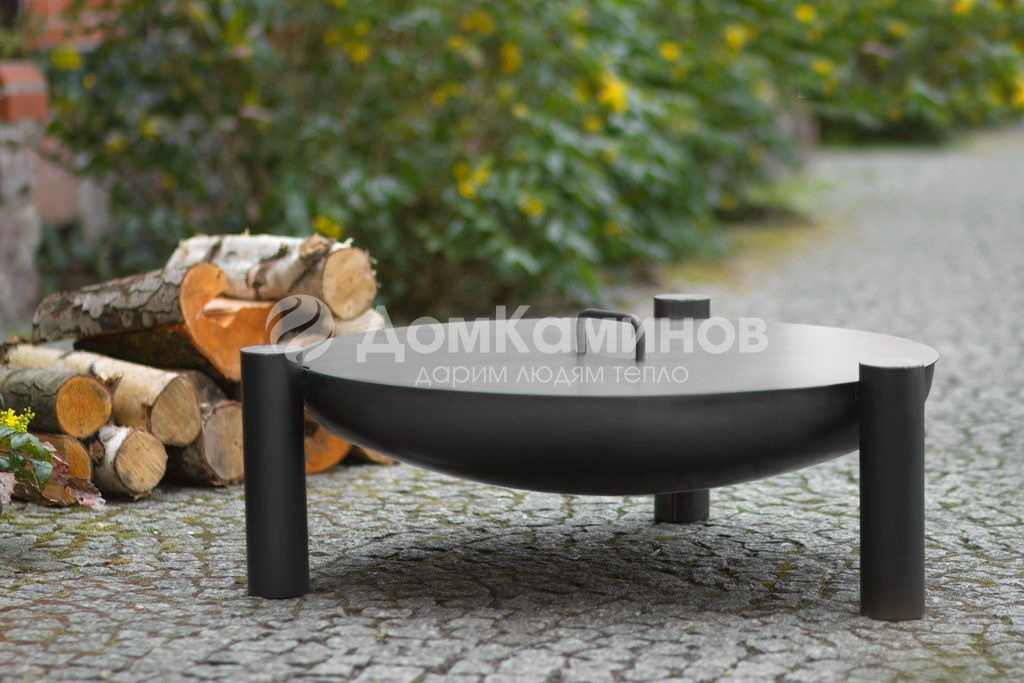 Крышка для очагов и костровых чаш из стали и чугуна диаметром 82 см, обработанная термоэмалью. Крышка для чаши защищается очаг от атмосферных осадков и пыли, предотвращает раздувание золы по участку после прогорания костра при ветровых потоках.