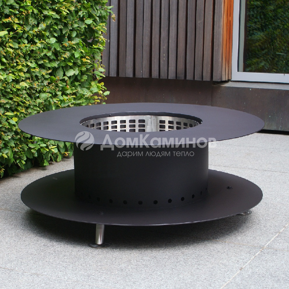 Практичный, элегантный и мультифункциональный уличный очаг. Съемная зольная корзина — огневая корзина выполнена из нержавеющей стали. Ролики для удобства движения — легко демонтируются для зимнего хранения. Встроенная дровница обеспечивает быструю подачу топлива. Он настолько красиво спроектирован, что отлично смотрится с огнем или без него. Очаг поставляется комплекте с крышкой. Дизайнерский очаг послужит отличным дополнением к Вашему внутреннему дворику. Очаг выполнен из 5 мм стали, диаметром 120 см. Высота дровницы 36 см, топка 50 см в диаметре.