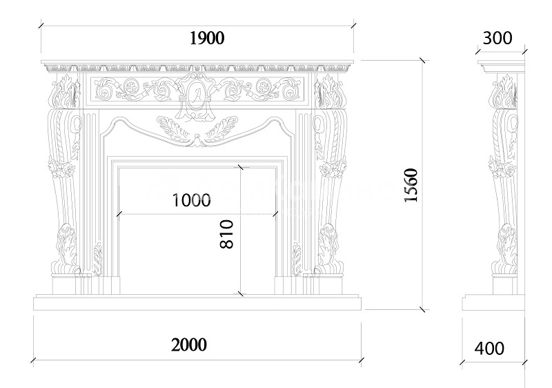Портал для камина ArteVero Cezar имеeт строгую классическую форму «П» с основанием 210 x 156 x 40 см. Максимальные внутренние размеры каминного портала соответствуют размерам топки: 100 x 81 см.