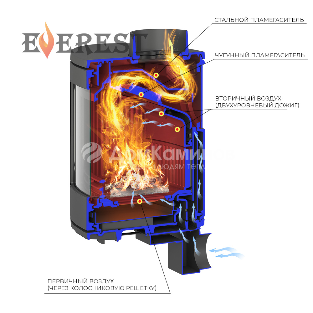 Печь-камин EVEREST S9 и S9M изготовлена из качественного жаростойкого чугуна с толщиной стенок 6-8 мм. Модель рассчитана на обогрев помещений объёмом до 180м³. Печь-камин имеет два пламегасителя: самый нагруженный пламегаситель изготовлен из жаростойкого чугуна (ГОСТ 1412-85), второй из особо прочной котловой стали 09Г2С. Топка печи-камина усилена чугунными вставками с системой двухуровневого вторичного дожига. С помощью этой функции по каналам подачи вторичного воздуха поступает воздух, который нагревается при прохождении между топочной камерой и стенками корпуса. Далее нагретый воздух через дефлектор поступает в топку, перемешивается с газами - продуктами горения, чем вызывает повторное возгорание. Регулировка этой системы, как и подача воздуха в колосниковую зону, осуществляется рычагом, расположенным слева в нижней части печи-камина. В правой нижней части расположена ручка регулировки системы чистое стекло, которая помогает оставаться стеклу чистым. Патрубок дымохода Ø 150мм – универсальный, со сменным положением. Он может быть установлен сверху или сзади в зависимости от размещения печи в помещении. На задней стенке расположен приточный патрубок, который дает возможность подвести приток воздуха вне комнаты.