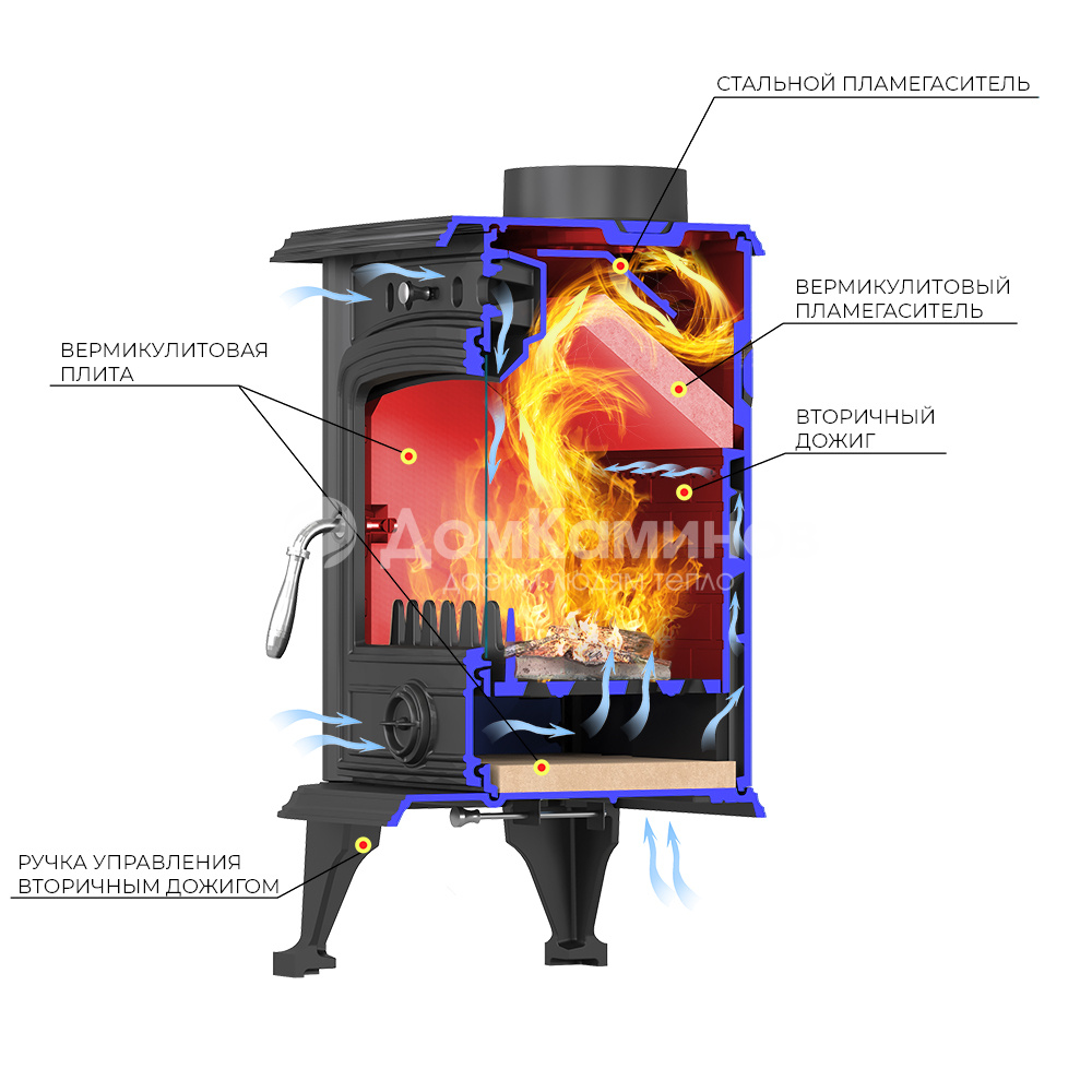 Боковые стенки и дно топки усилены вермикулитовыми плитами , задняя двойная чугунная стенка с системой вторичного дожига. С помощью этой функции по каналам подачи вторичного воздуха поступает кислород, который нагревается при прохождении между топочной камерой и стенками корпуса. Далее нагретый воздух через дефлектор поступает в топку, перемешивается с газами - продуктами горения, чем вызывает повторное возгорание. Регулировка этой системы осуществляется рычагом, расположенным в нижней части печи-камина.