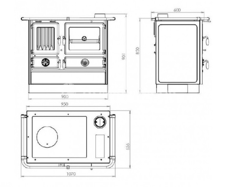 Дровяная кухонная плита предназначена для отопления небольших дачных домов и приготовления пищи. Печь изготовлена из чугуна и эмалированной стали. Эмалированное покрытие обеспечивает продолжительный срок службы печи и отвечает за эстетичный внешний вид. Доступно четыре цвета эмалированного покрытия: красный, кремовый, бордовый и черный. Печь укомплектована большой чугунной варочной поверхностью с одной конфоркой и стальным эмалированным духовым шкафом для приготовления пищи. Духовой шкаф габаритами ВхШхГ, мм - 265х350х465 оснащён протвенем и датчиком температуры. Для подключения к системе водяного отопления используется теплообменник-змеевик объёмом 11 л и мощностью 8.5 кВт. Топочная камера состоит из чугунных плит. Дверцы топки и духовки укомплектованы термостойкой стеклокерамикой. Замок и уплотнительный шнур обеспечивают герметичное закрывание дверец. Проём для загрузки дров Ш×В - 280х230 мм. Ящик для золы спрятан за герметичной чугунной дверцей. Дверца зольника снабжена устройством точной регулировкой подачи воздуха в топочную камеру. Колосниковая решетка подвижная для встряхивания золы. Для подключения к дымоходу предусмотрен патрубок, который монтируется на верхней и задней части плиты, справа или слева.