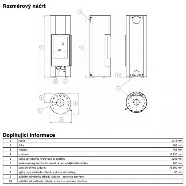 Выход дымохода возможен вверху печи и сзади, также есть возможность подвода воздуха на горение с улицы или из подвального помещения. Для увеличения теплоотдачи печи предусмотрен комплект аккумулирующих элементов (опция), которые устанавливаются с веху топки вокруг дымоходной трубы.