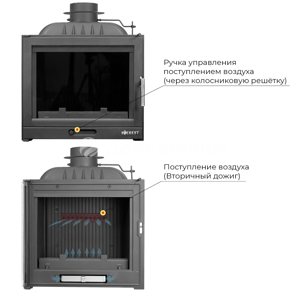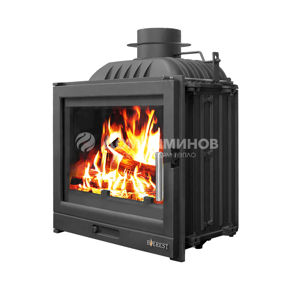 Каминная топка EVEREST U10 изготовлена из качественного жаростойкого чугуна (ГОСТ 1412-85) с толщиной стенок 6-10 мм. Вес топки составляет 98 кг. Модель рассчитана на обогрев помещений объёмом до 200 м³. Топка усилена чугунными вставками с системой вторичного дожига. С помощью этой функции по каналам подачи вторичного воздуха поступает воздух, который нагревается при прохождении между топочной камерой и стенками корпуса. Далее нагретый воздух через дефлектор поступает в топку, перемешивается с газами - продуктами горения, чем вызывает повторное возгорание. Патрубок дымохода диаметром 150 мм не универсальный. оснащён поворотным шибером. Заслонка сделана из чугуна, а её положение регулируется ручкой на передней панели топки.