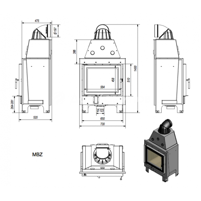 Подовое (бесколосниковое) горение в топке. Дно топки значительно снижено по отношению к двери (продукт сгорания находится ниже уровня подачи воздуха). Полное сгорание древесины и очень маленькая фракция золы-пепел. Управление горением в топке осуществляется с помощью только одного регулятора подачи воздуха. Патрубок дымохода поворотный с возможностью регулировки на 360 градусов.