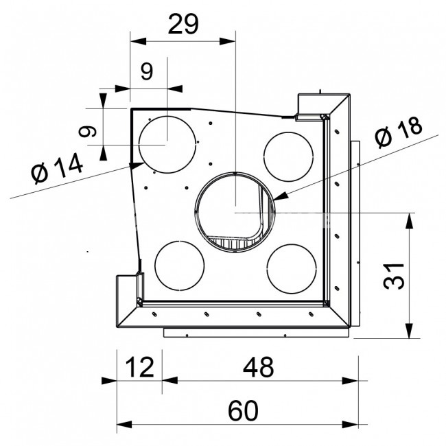 Угловая дровяная каминная топка. V = принудительная вентиляция.