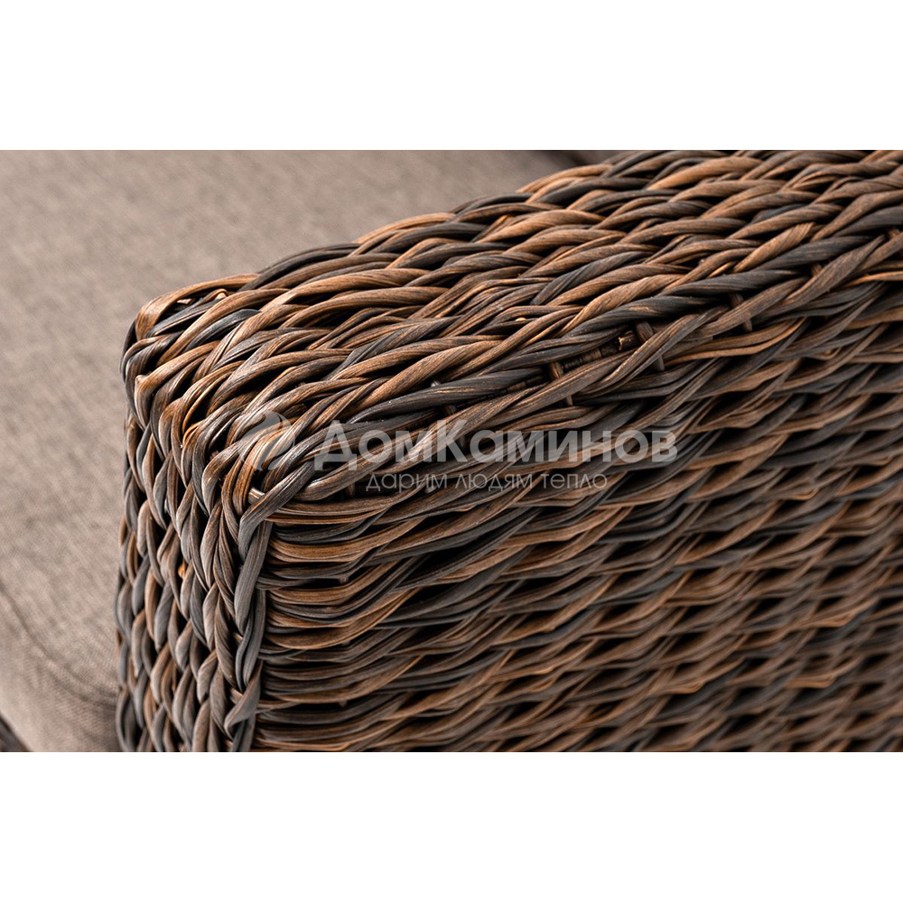 Диван «Капучино» двухместный с каркасом из прочного алюминия.Размер модели – 1700×850×810мм.Диван выполнен из искусственного ротанга вида "гиацинт" соломенного цвета, оплетенного вручную.Двухместный диван дополнен несколькими подушками со съемными темно-серыми чехлами. Они изготовлены из прочного полиэстера, плотность которого достигает 230гр/м2. Предусмотрена влагоотталкивающая пропитка ткани для защиты текстильных изделий от намокания.
