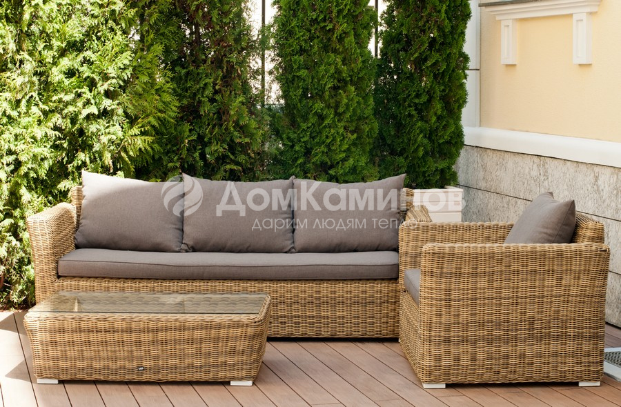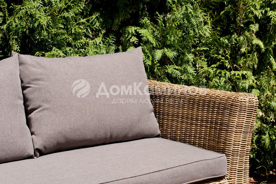 Диван «Капучино» предназначается для размещения трех человек. Его основание изготовлено из алюминиевого каркаса, способного выдерживать большие нагрузки. Мебель декорирована ручным круглым плетением, выполненным из искусственного ротанга соломенного цвета. Трехместный диван укомплектован мягкими подушками, которые защищены съемными чехлами в темно-сером оттенке. При их пошиве используется износостойкий полиэстер, плотность которого достигает 230гр/м2. Предусмотрена влагоотталкивающая пропитка.