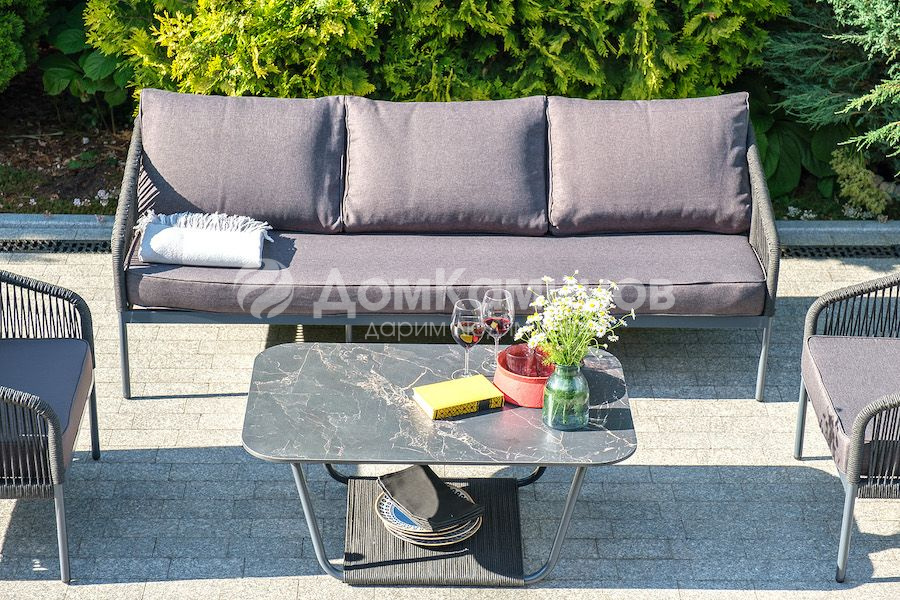 Трехместный диван "Канны" с подушками в комплекте.Диван имеет алюминиевый каркас, окрашенный порошковой краской в темно-серый (RAL7024) цвет. Боковины каркаса и спинка вручную оплетены роупом - эластичными синтетическими лентами, изготовленными из высокопрочных полиэфирных волокон. Цвет оплетки в тон каркасу - темно-серый. Тип ткани - рогожка.Подушки состоят из наполнителя и съемных чехлов. Материал - 100% полиэстер, плотностью 300гр/м2.Размер плетеного дивана: 2030×700×750мм.