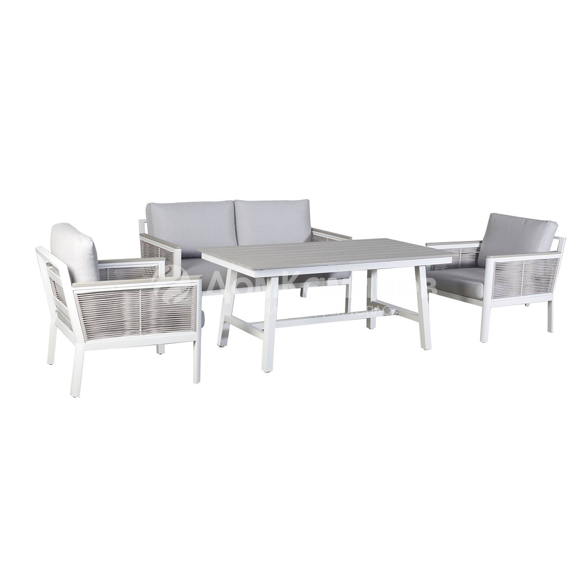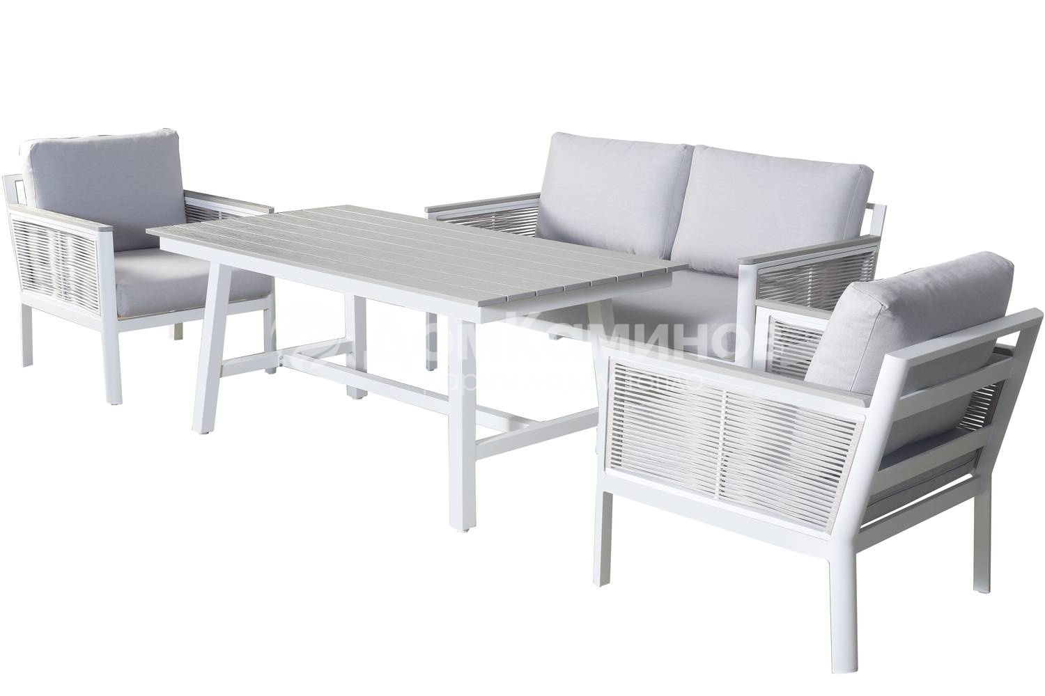 В состав комплекта входит: диван, два кресла, стол (столешница из ДПК).