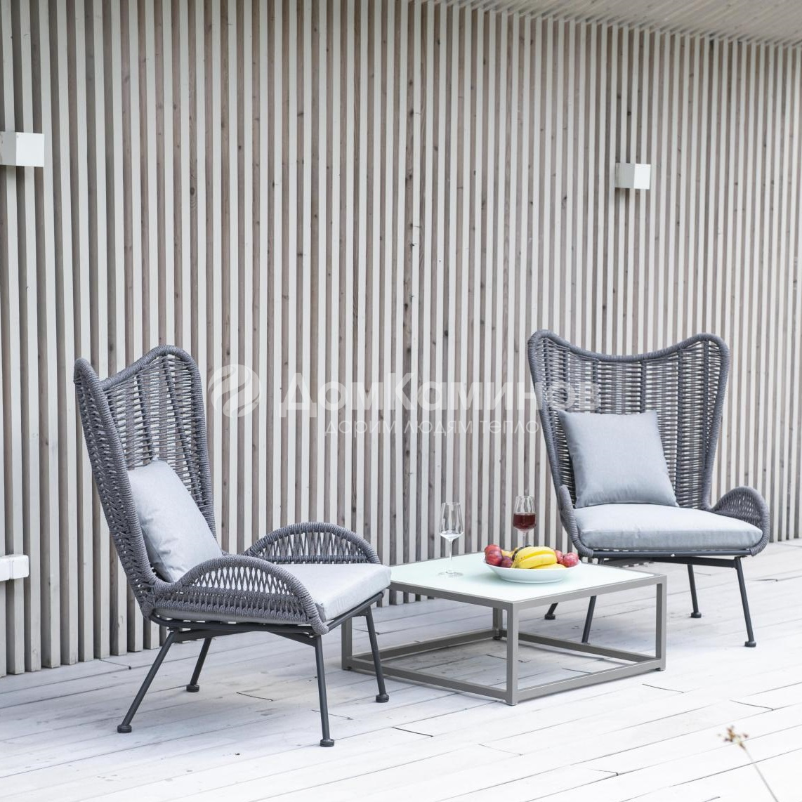 Кофейная группа "Мадрид": 2 кресла из алюминия, оплетенного синтеческим полиэфирным волокно, в комплекте с подушками, цвет темно-серый, кофейный стол, алюминиевый каркас, стеклянная матовая столешница толщиной 5 мм.