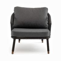 Кресло имеет алюминиевый каркас, окрашенный порошковой краской в темно-серый (RAL7024) цвет. Боковины каркаса вручную оплетены роупом - эластичными синтетическими лентами, изготовленными из высокопрочных полиэфирных волокон. Цвет оплетки - темно-серый. На ножках кресла идут дубовые наконечники (заглушки).