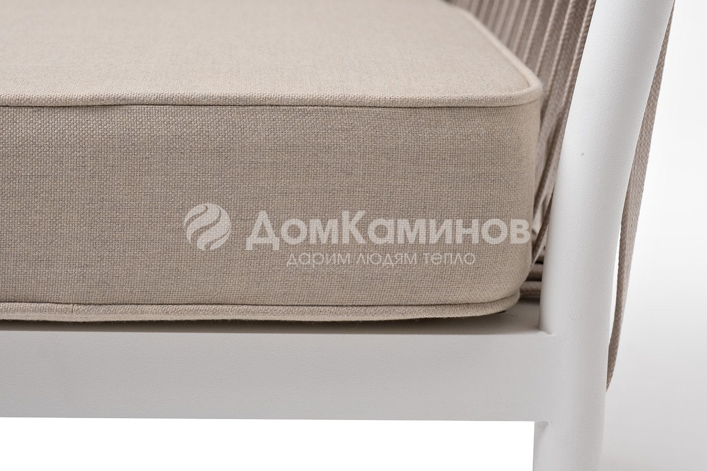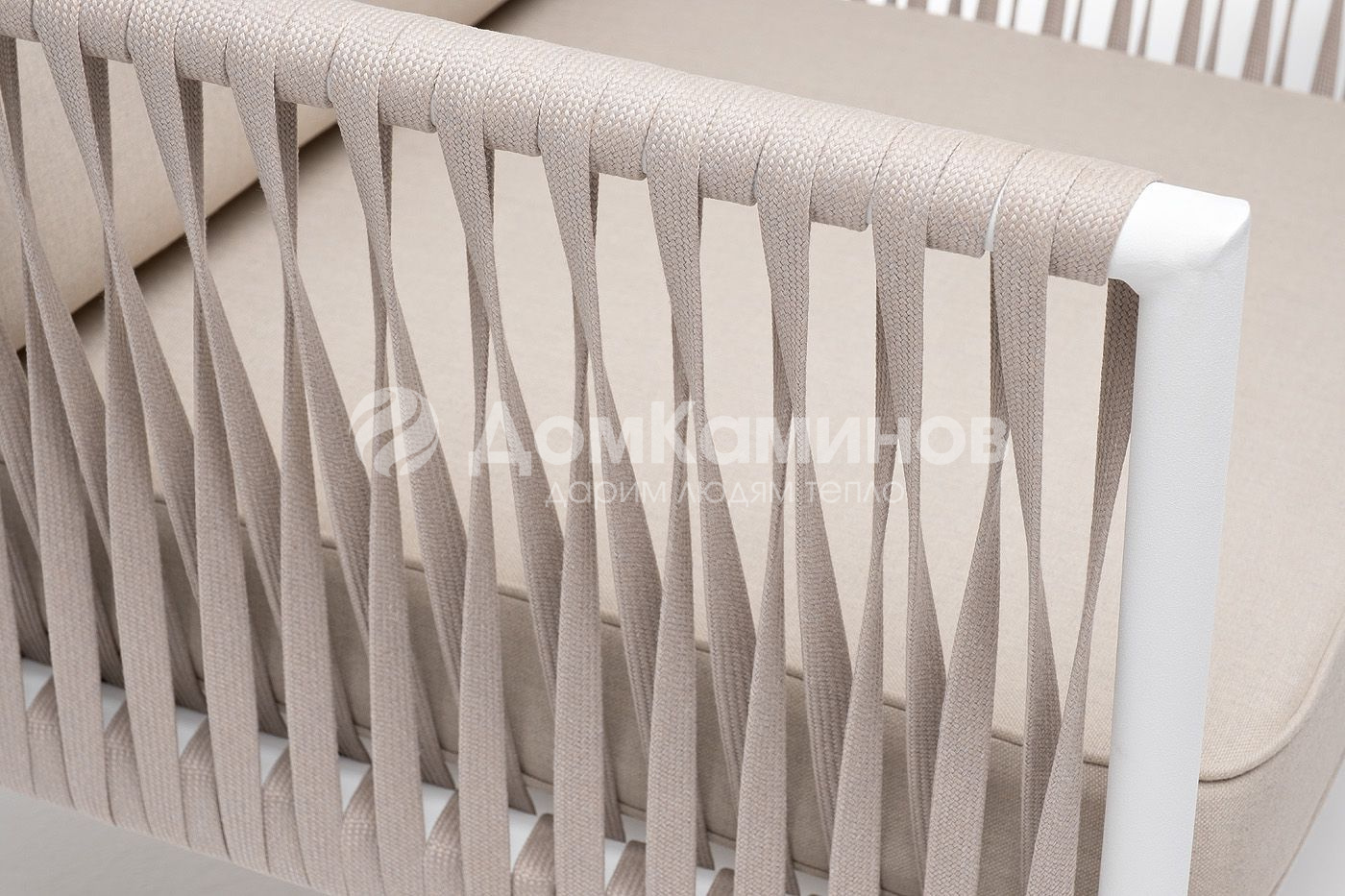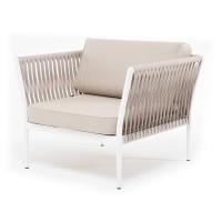 Плетеное кресло "Касабланка" с подушками в комплекте.Кресло имеет алюминиевый каркас, окрашенный порошковой краской белового цвет. Боковины каркаса вручную оплетены роупом - эластичными синтетическими лентами, изготовленными из высокопрочных полиэфирных волокон. Цвет оплетки - бежевый.Подушки состоят из наполнителя и съёмных чехлов, которые обработаны влагоотталкивающей пропиткой бежевого цвета. Чехол можно стирать в стиральной машине с использованием порошков.Размер кресла: 900×800×695 мм.