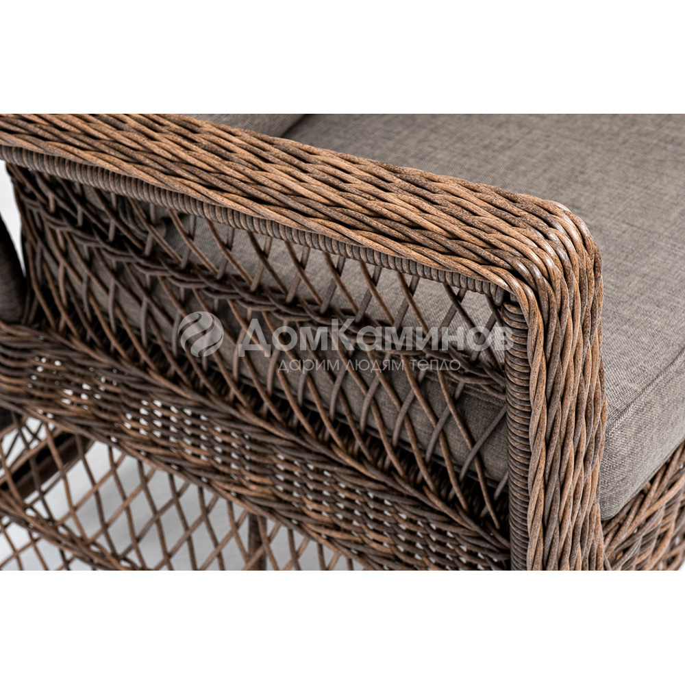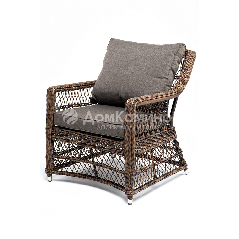 Укомплектовано плетеное кресло удобными мягкими подушками, одна из которых располагается в области спинки. Они выполнены в коричневом оттенке. При пошиве тканевых изделий используется полиэстер, плотностью 230 гр/м2. Он в обязательном порядке проходит обработку влагоотталкивающей пропиткой.