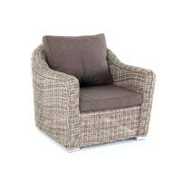 Кресло из искусственного ротанга "Фабриция" произведено из прочного алюминиевого каркаса с ручным плетением серого цвета. Размеры составляют 86×86×82см. Сиденье и спинка оснащены удобными комплектными подушками из 100% полиэстера, пропитанного специальным водоотталкивающим составом.
