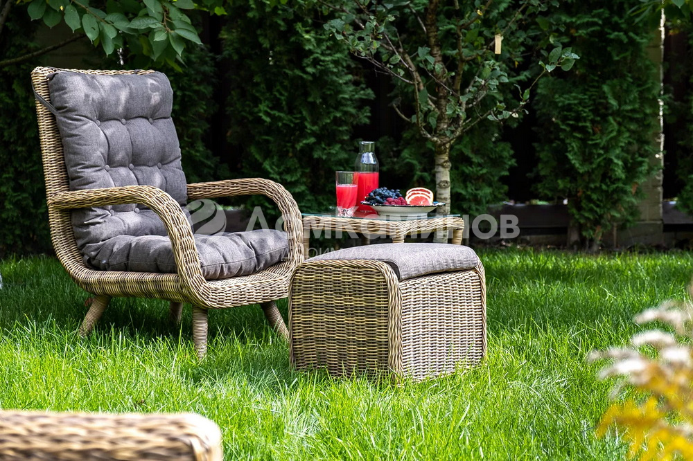 Одноместная лаунж-зона "Толедо" для зоны отдыха выполнена из круглого искусственного ротанга в натуральном соломенном цвете.Состоит из:- одного кресла - 680×760×900 мм- одного пуфа - 510×420×470 мм- одного журнального столика - 450×450×520 ммКаркас - прочный алюминий, который выдерживает нагрузки до 150 кг.Кресло и пуф укомплектованы подушками со съемными чехлами из влагостойкого 100%-го полиэстера.