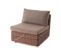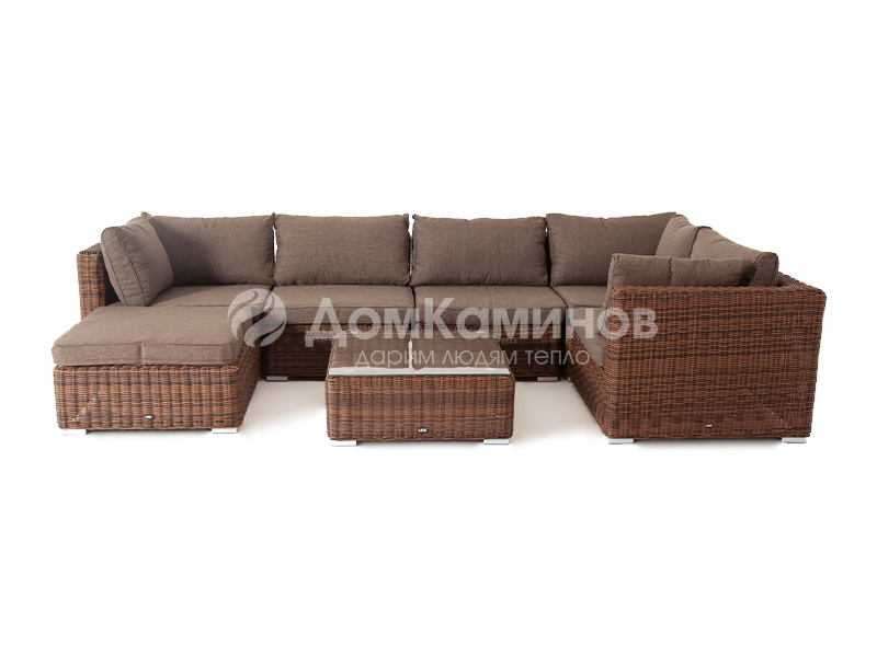 Прямой модуль "Лунго", выполненный из круглого искусственного ротанга коричневого оттенка, позволяет использовать не только как самостоятельный элемент, но и быть частью лаунж-зоны, в которую данная модель превосходно интегрируется.Габариты составляют - 730х850х670 мм, в комплект входят подушки серого цвета.