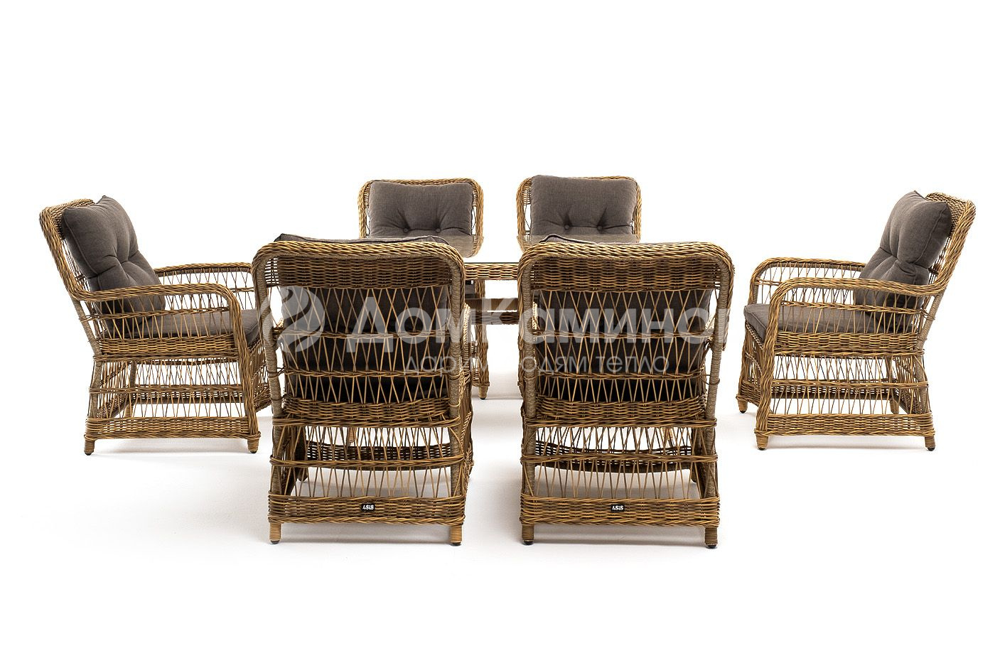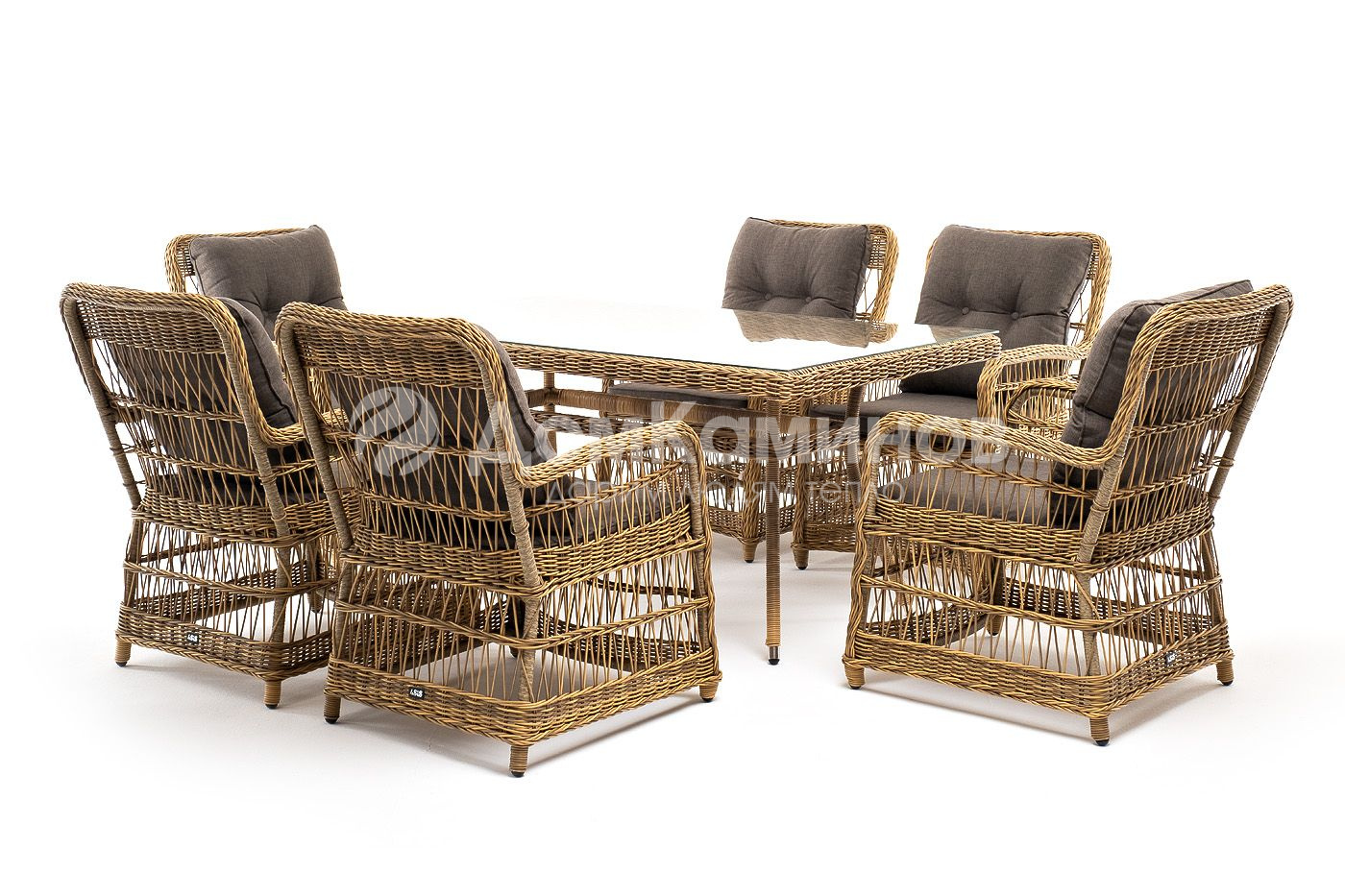 Садовая обеденная группа на 6 персон «Цесена» из ротанга. В комплекте: большой прямоугольный обеденный стол (1600×900×750 мм) и 6 кресел (600×800×910 мм).